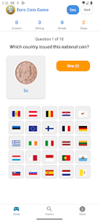 Euro Coin Game är en utbildningsapplikation för Android som syftar till att lära användare om euro-mynt och deras ursprungsländer. Spelet innehåller en omfattande samling av euro-mynt från hela Europa, där spelare får möjlighet att se de nationella designen av varje mynt. Genom att välja rätt flagga för det land som utfärdat myntet, kan spelare testa sin kunskap och förbättra sina färdigheter. Data om mynten är hämtad från Europeiska centralbanken och är verifierad för noggrannhet.